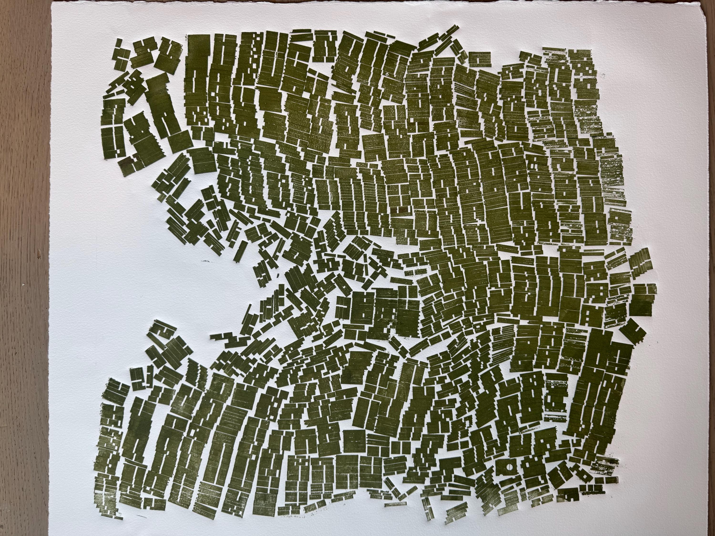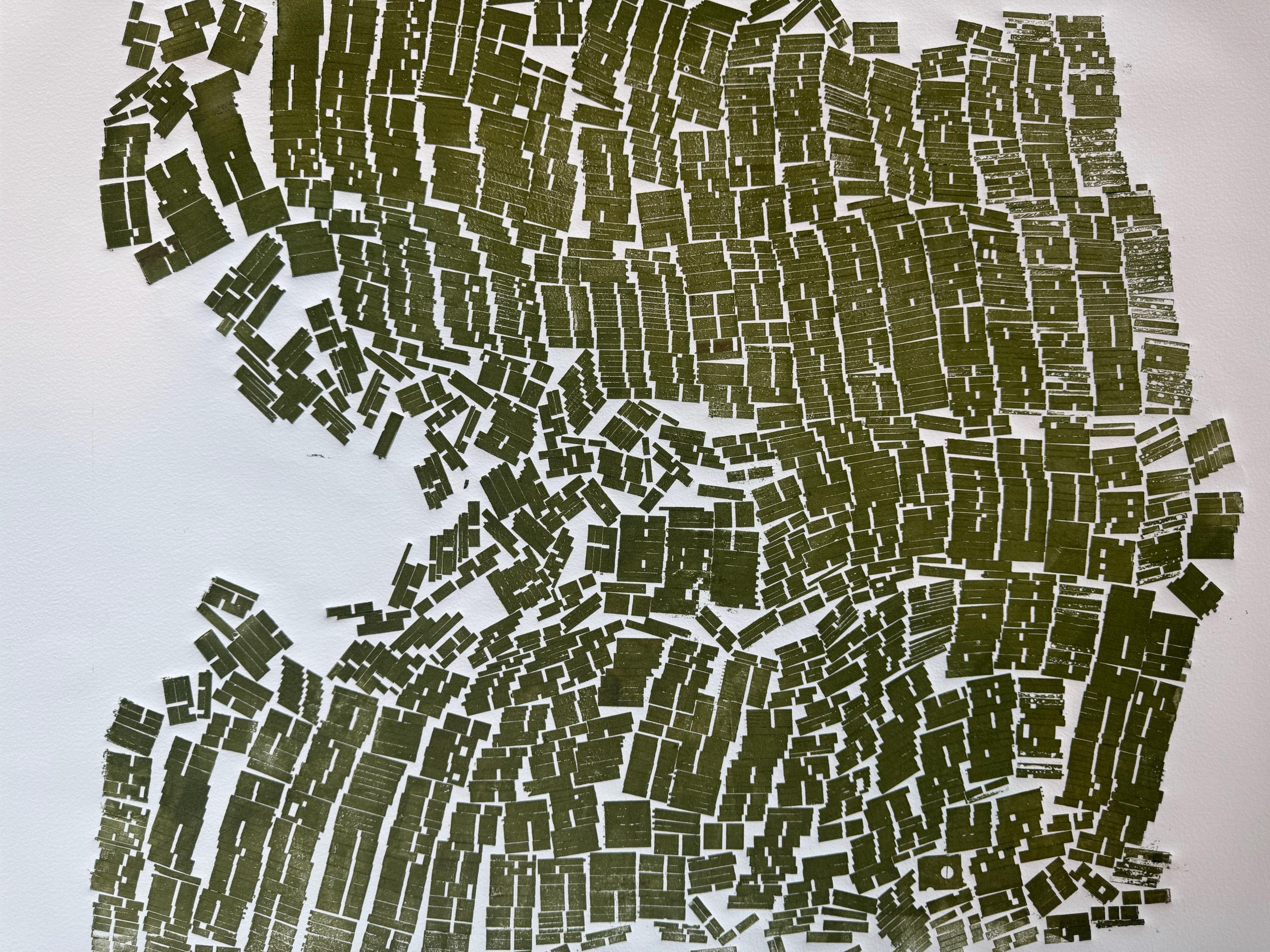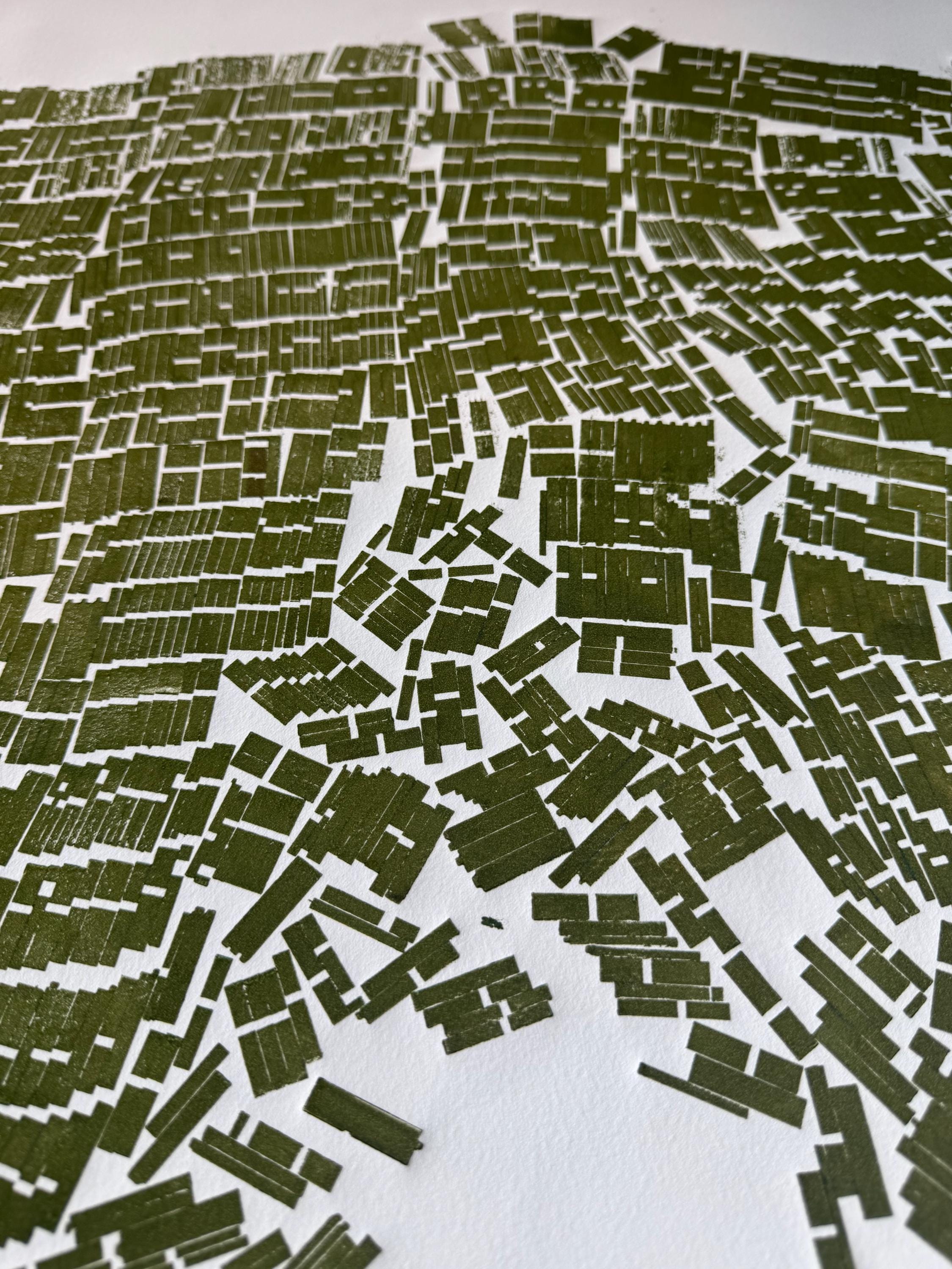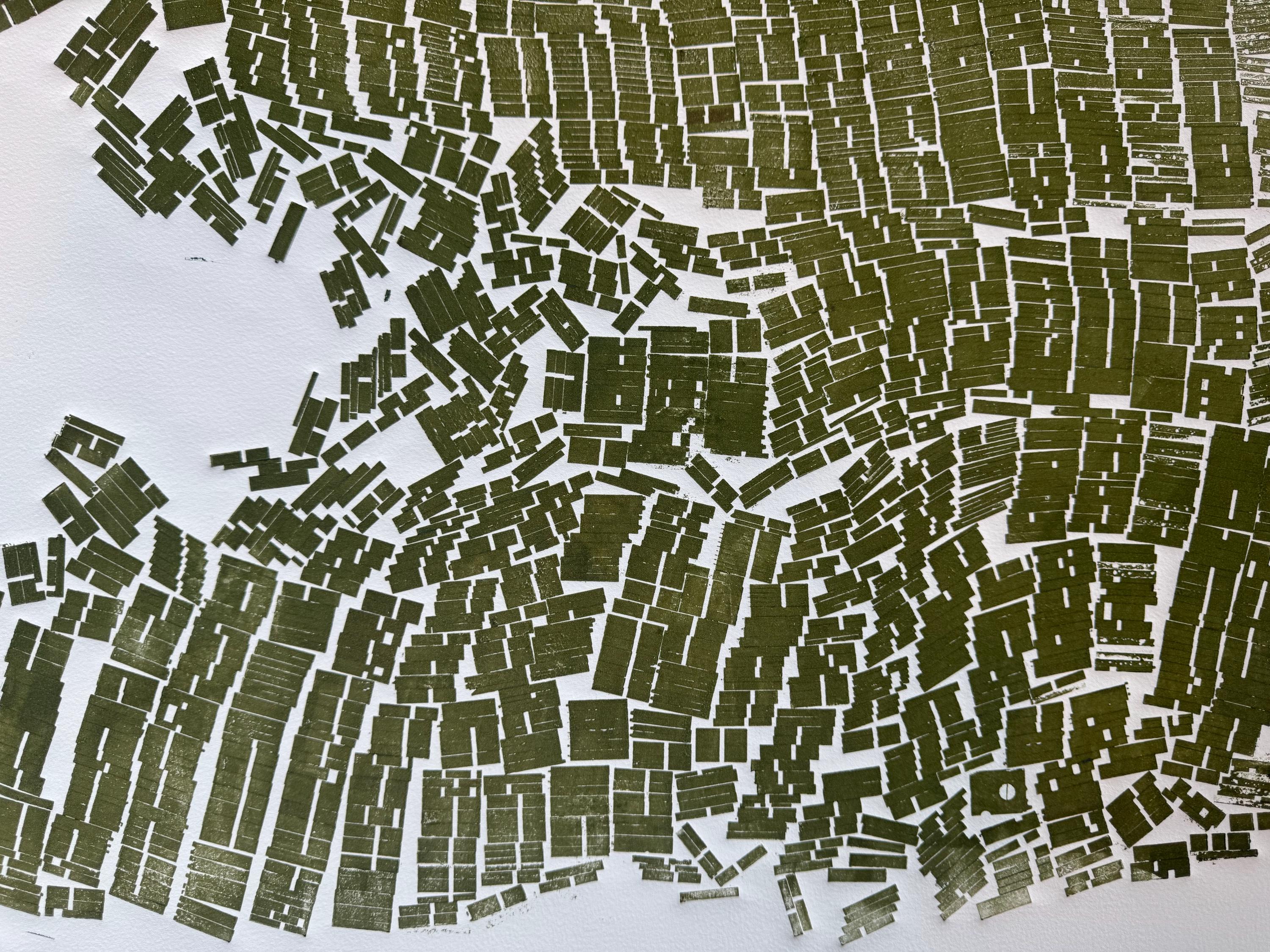 A fractured block of deep green marks spreads across the paper like a broken map or an aerial terrain. Hundreds of type pieces form an irregular grid, but the structure feels disrupted—tilting, scattering, and breaking apart at the edges. The negative space between the forms becomes just as important as the ink itself, cutting through the composition like cracks, pathways, or missing information.