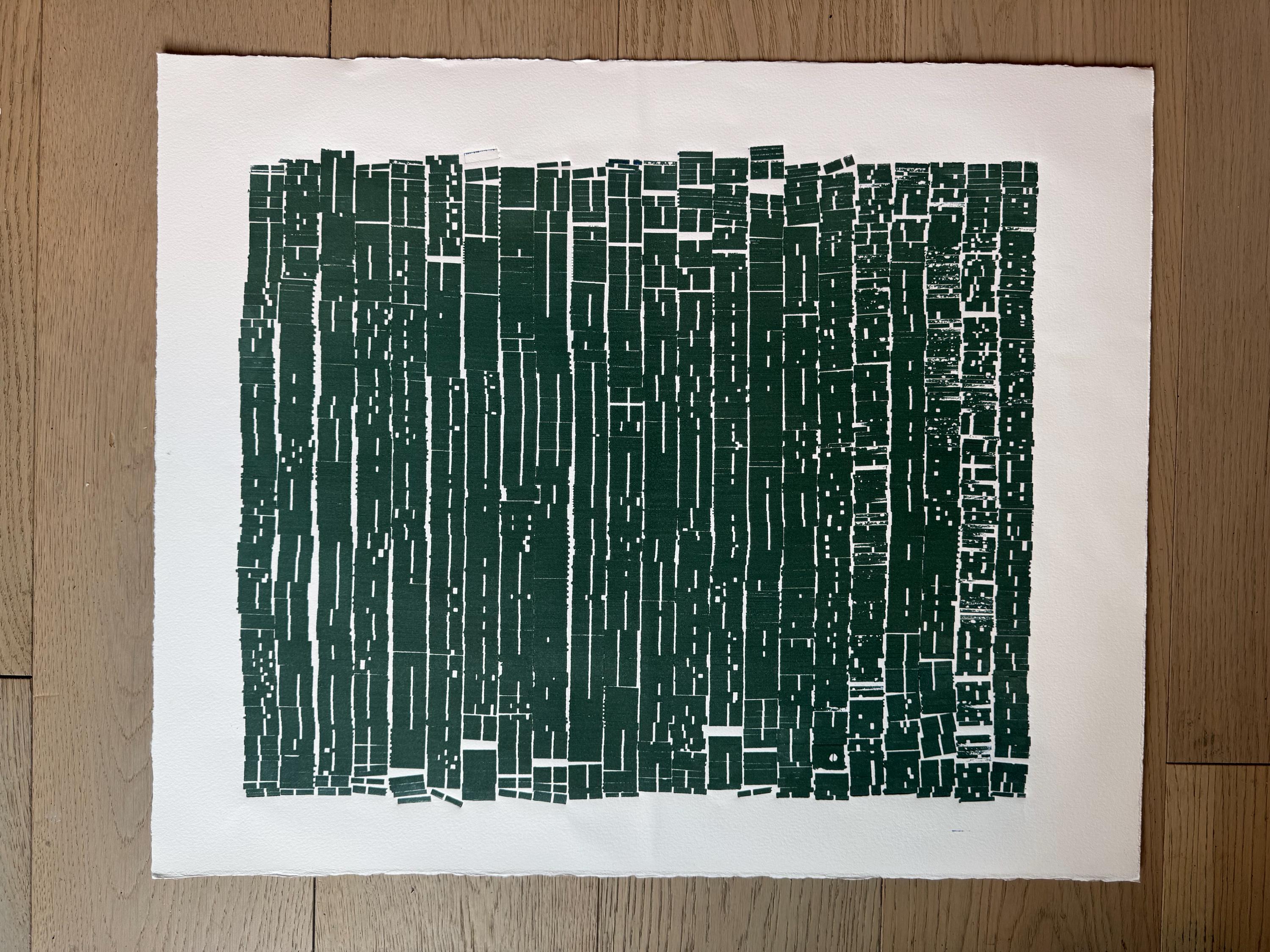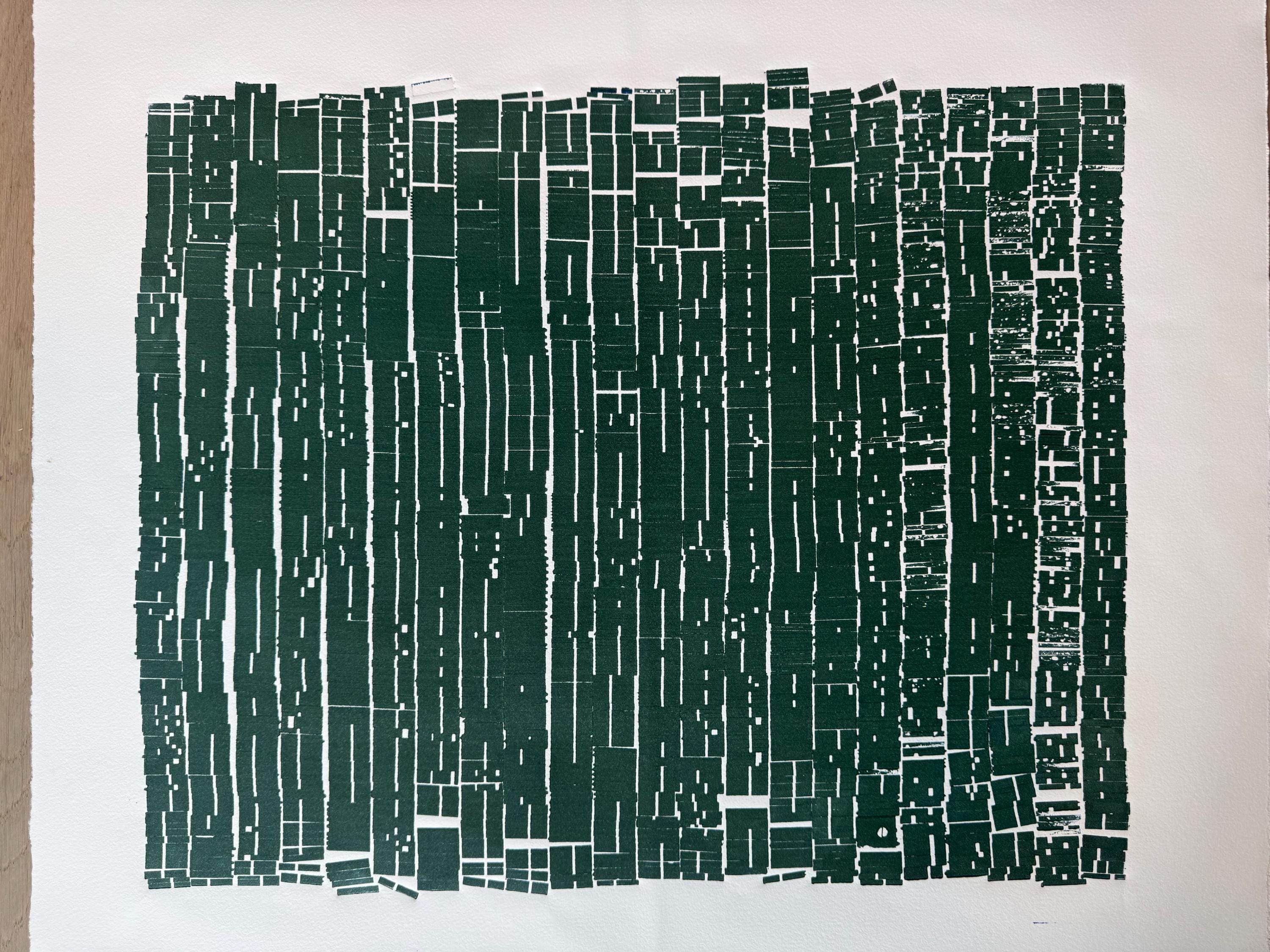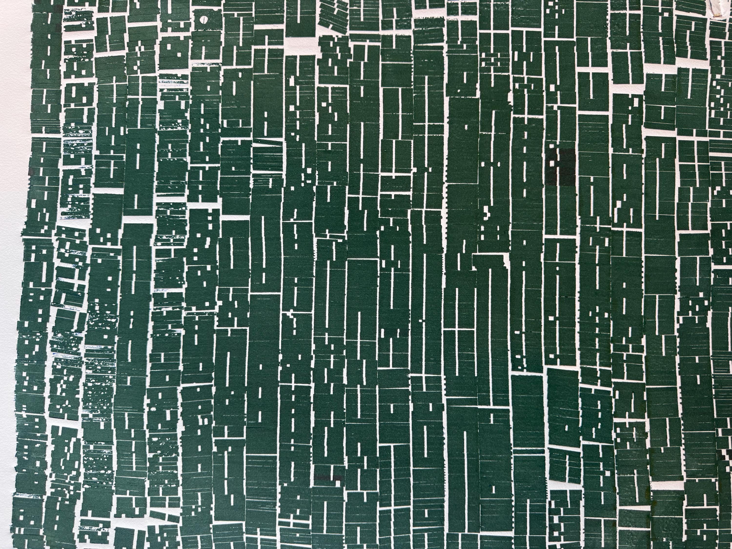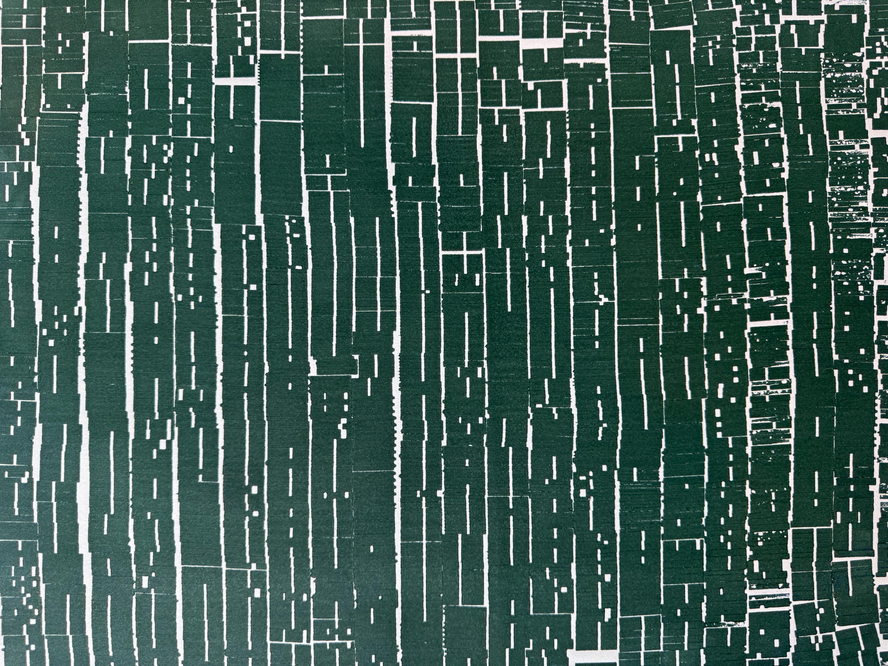 A dense field of vertical forms—built from hundreds of individual type pieces—fills the composition like a compressed archive, a coded document, or a wall of erased text. The deep green ink reads as both organic and industrial, evoking forest canopy, weathered wood, or an urban grid seen from above. Thin channels of white negative space cut through the surface like fractures, streets, or missing lines—suggesting interruption, deletion, and absence.