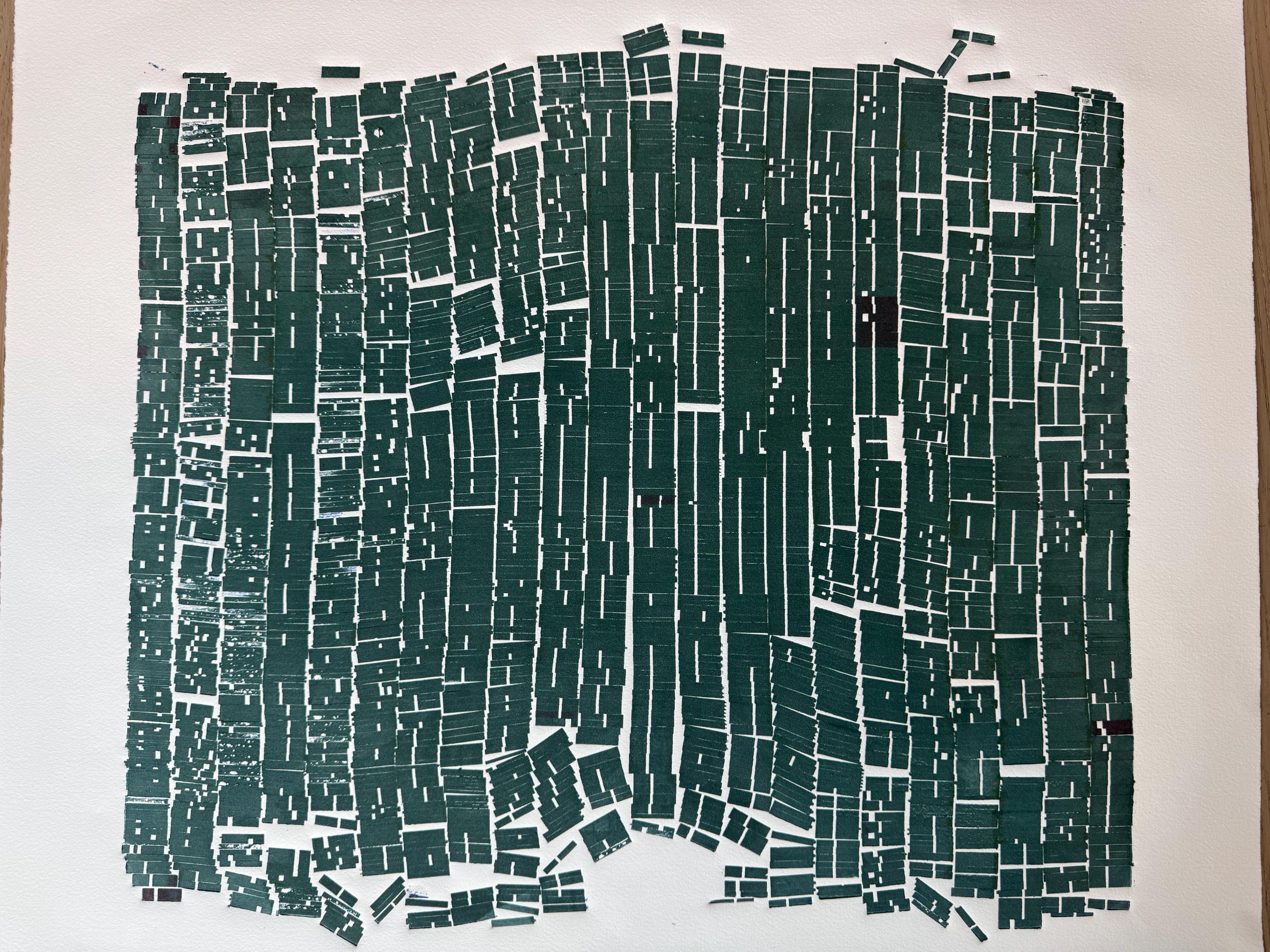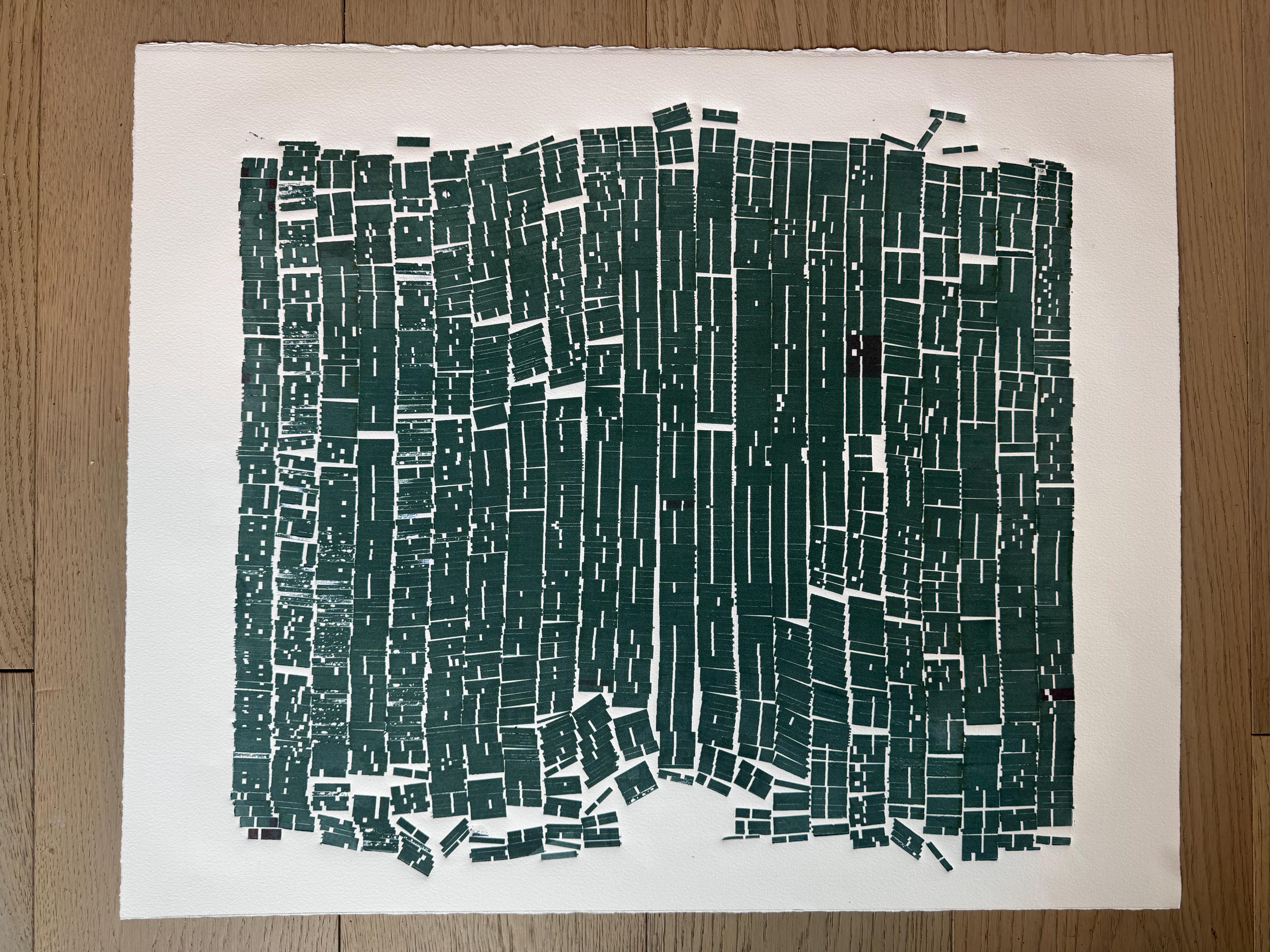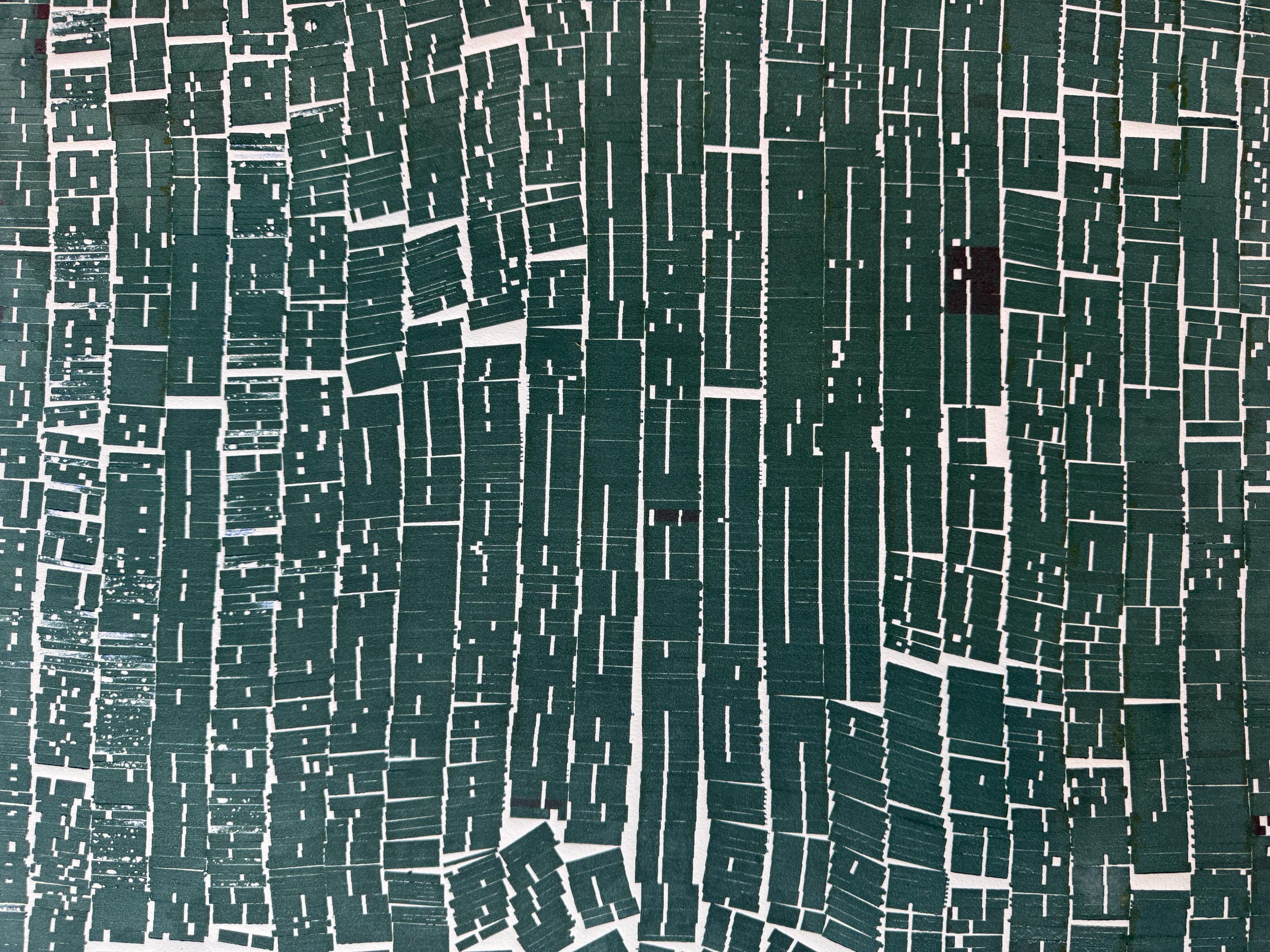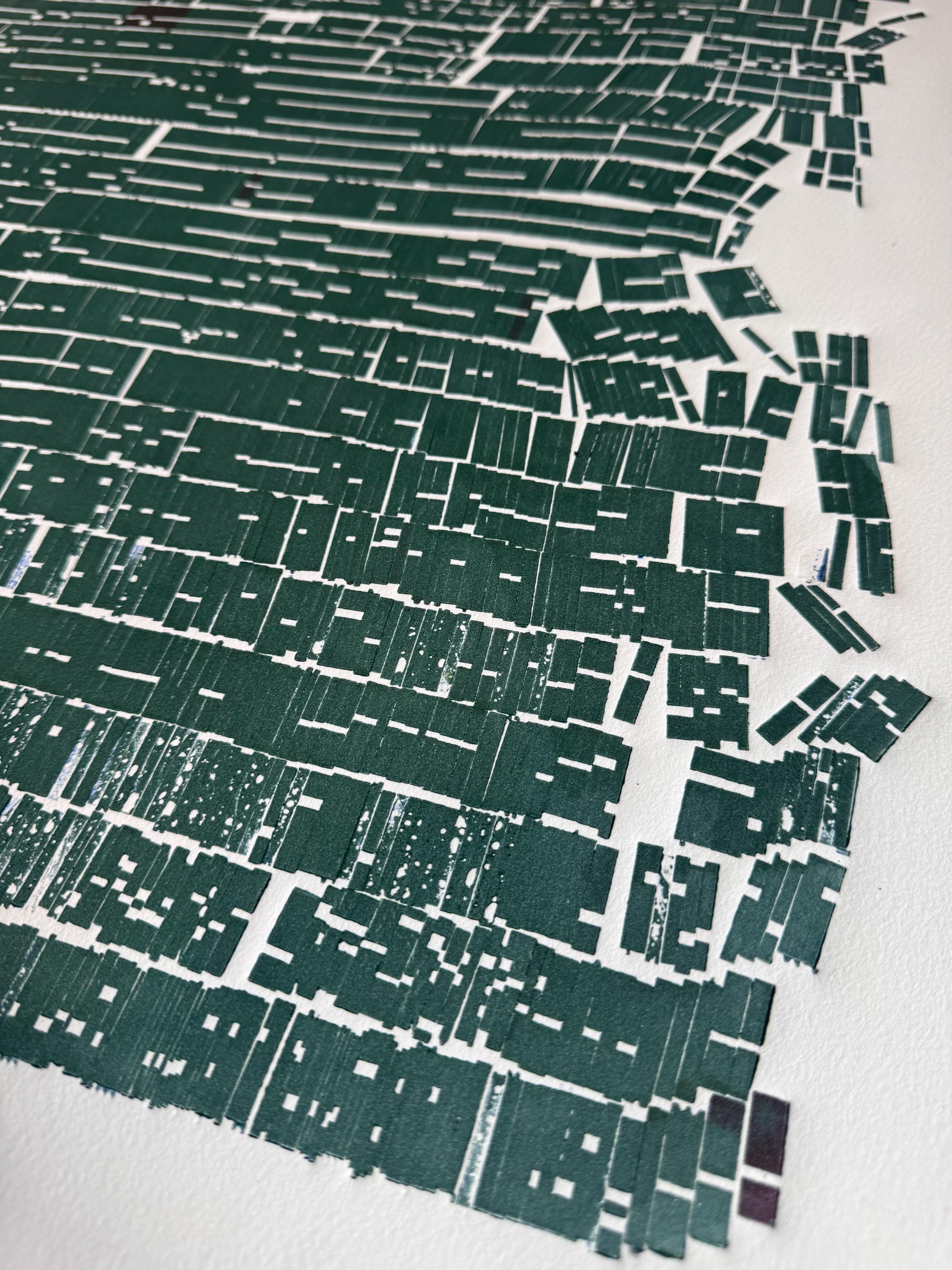 A block of deep green marks fills the center of the paper like an overcrowded record: narrow vertical forms stack tightly together, creating the impression of a compressed city grid or a wall of data. The surface is built from countless individual pieces of type—each one once meant to speak clearly—now reassembled into an unreadable language of texture. Thin seams of white break through the ink like fractures, erasures, or gaps in a narrative, suggesting interruption and distortion.
