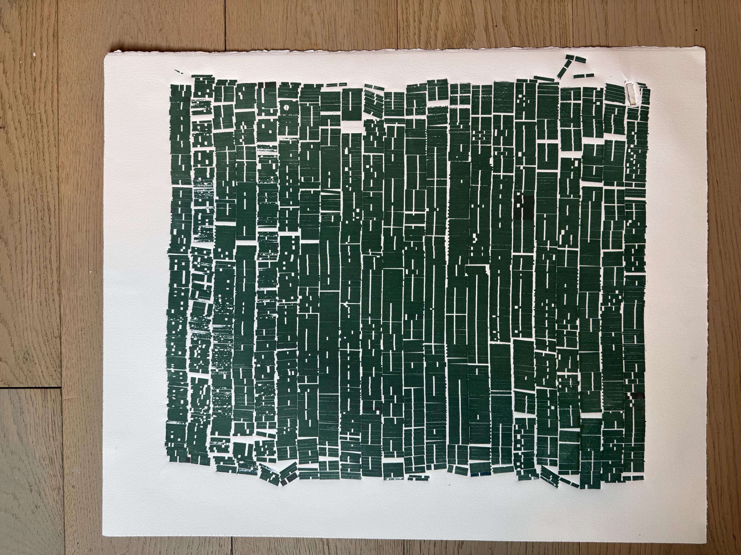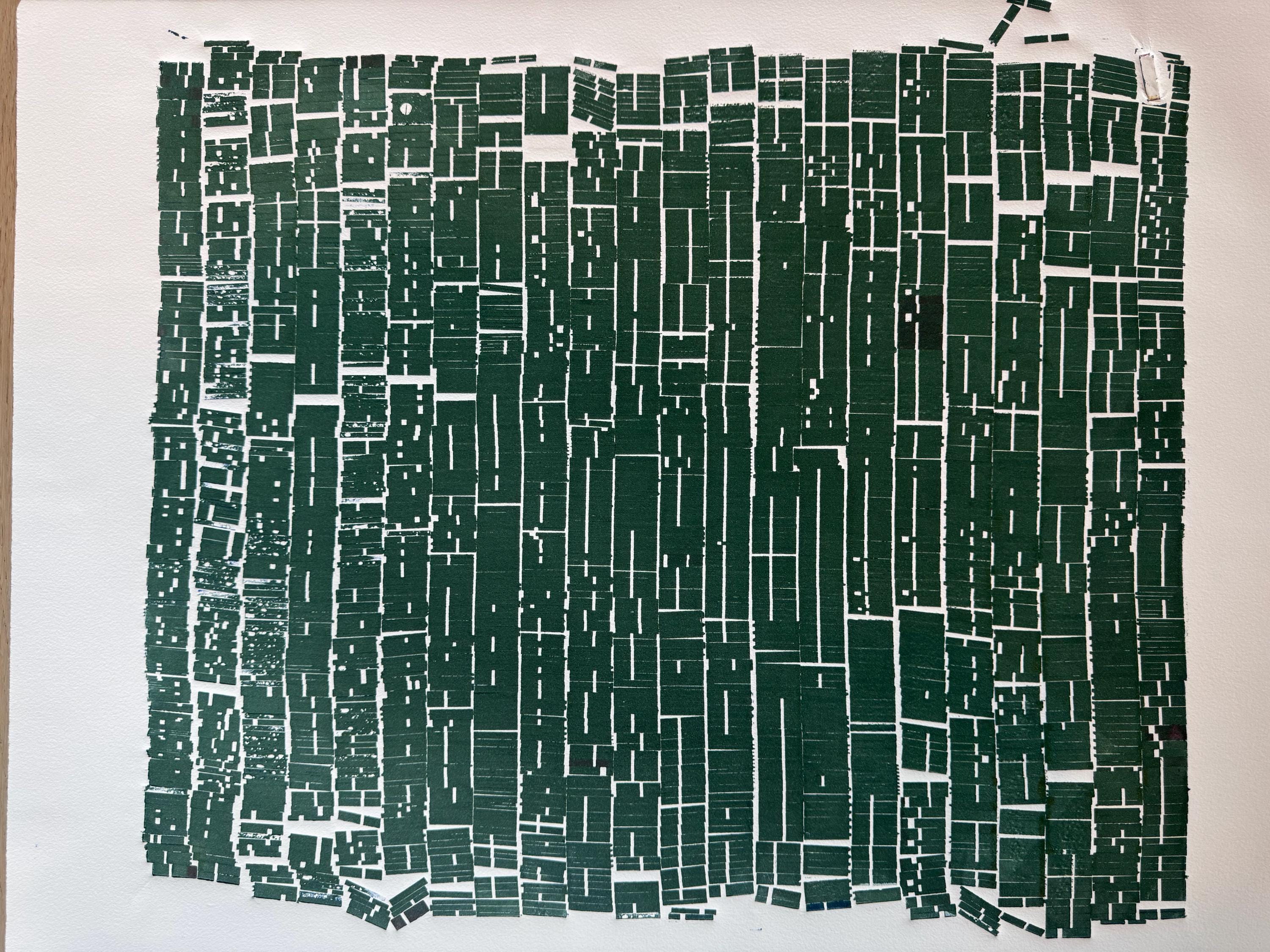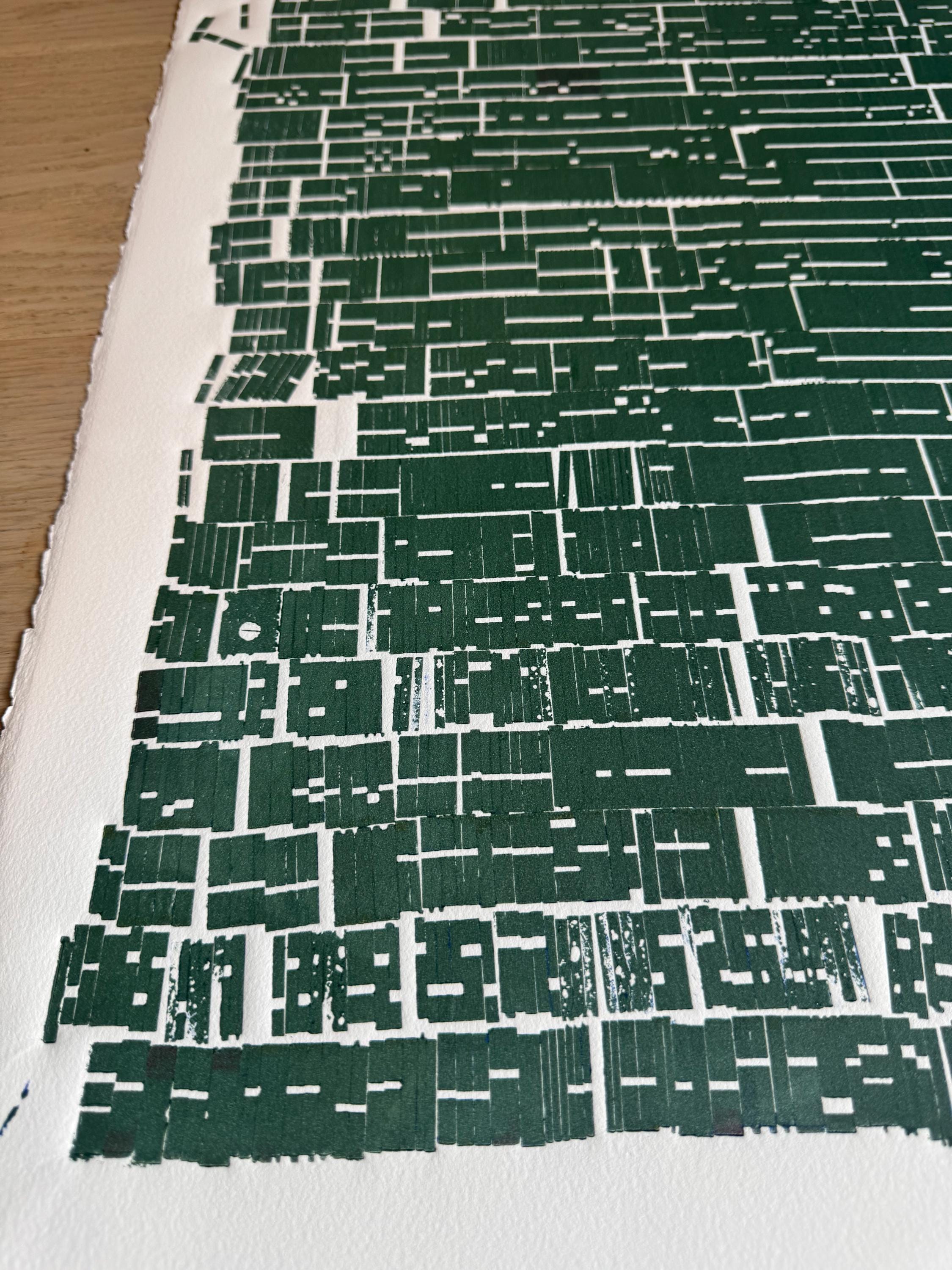 A dense rectangular field of deep green impressions fills the paper like a compacted grid or coded document. Hundreds of type pieces align into vertical columns, creating the feeling of order imposed: narrow blocks stacked tightly, like rules, ranks, or routines. The rhythm is strict, almost bureaucratic—yet the surface is imperfect. Slight shifts, gaps, and uneven edges reveal the physical reality of the process: pressure, ink, and handmade variation pressing against the demand for uniformity.