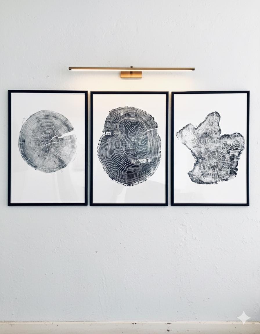 Set of 3 tree ring prints made by hand and signed by Erik Linton. Each 24x36 inches.